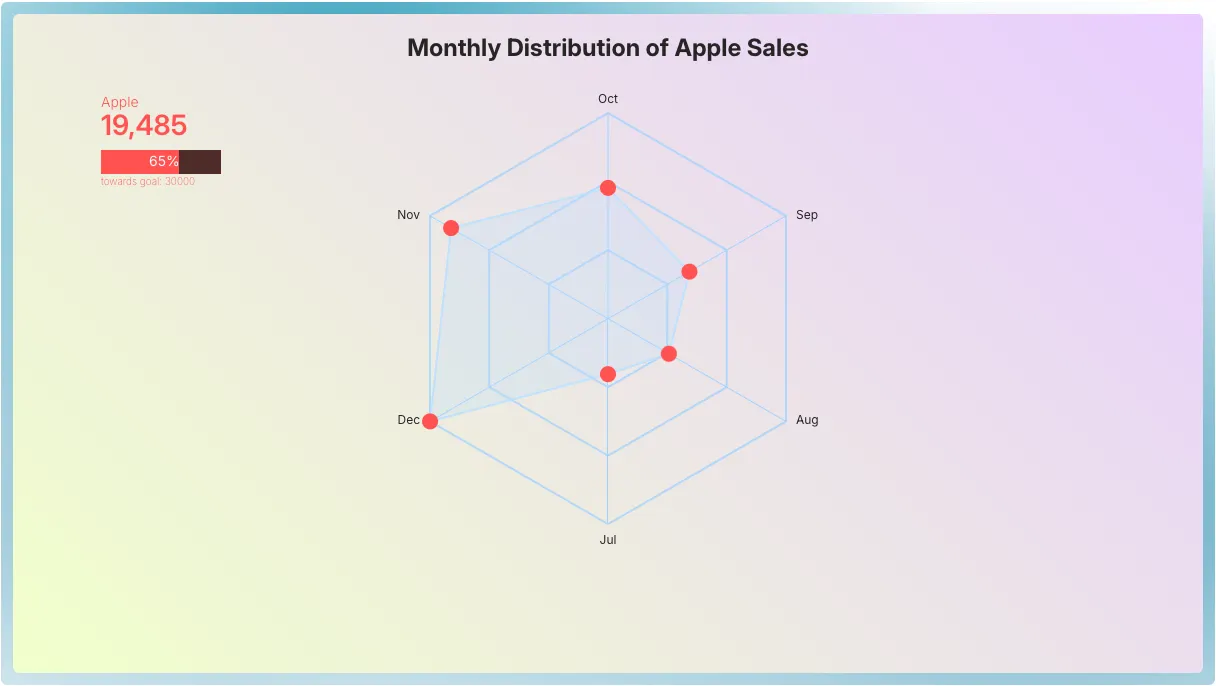 In the pie chart section, we compared a polarized pie chart to a circular bar chart. Similarly, a radar chart can be thought of as a circular line chart. Instead of using a traditional axis to measure metric values, a radar chart employs a web-like structure as its context. The radius from the center represents the metric value, with the distance from the center indicating the magnitude of the value compared to others.