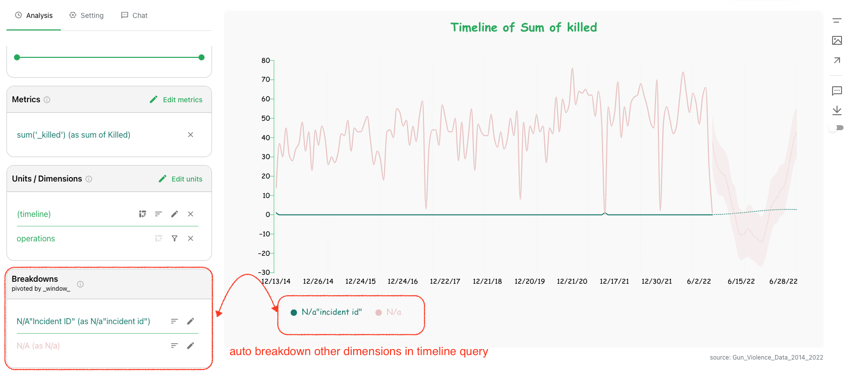 However, when working with multiple dimensions in timeline, the (timeline) dimension will always be pivoted, put the others as breakdown automatically.