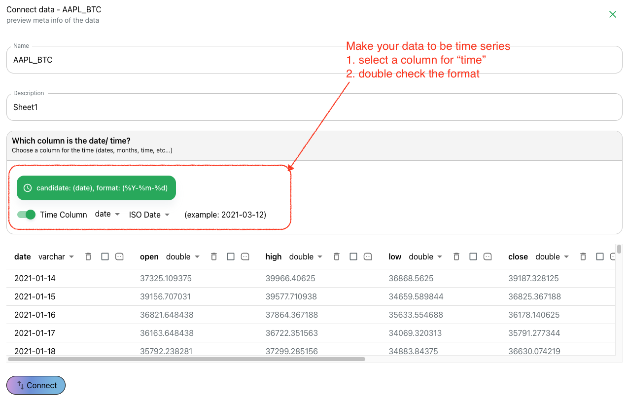 When you establish a new data connection, you have an option to enable it to be time series data. In below illustrated option, you should specify the column name and its time value pattern: